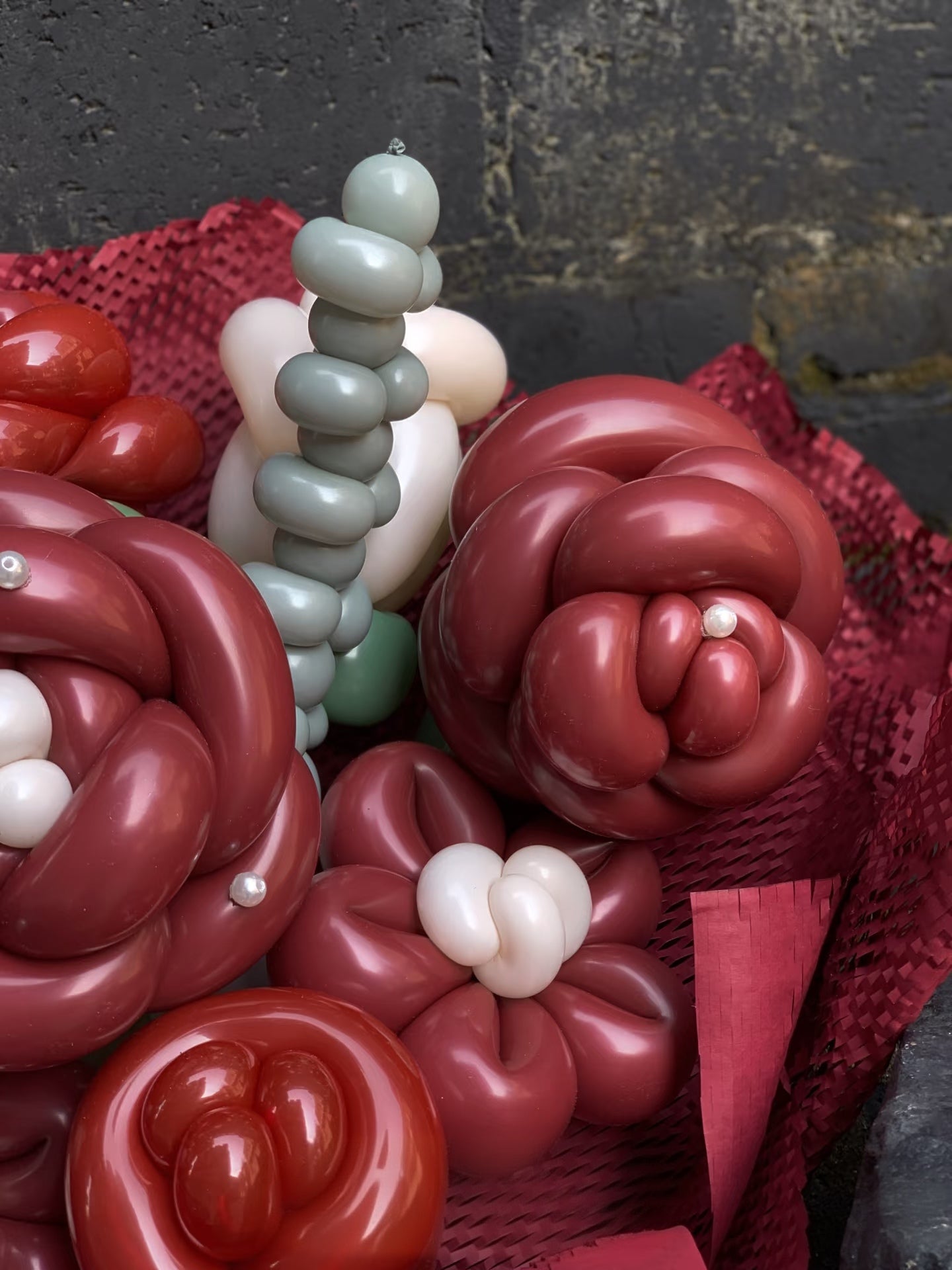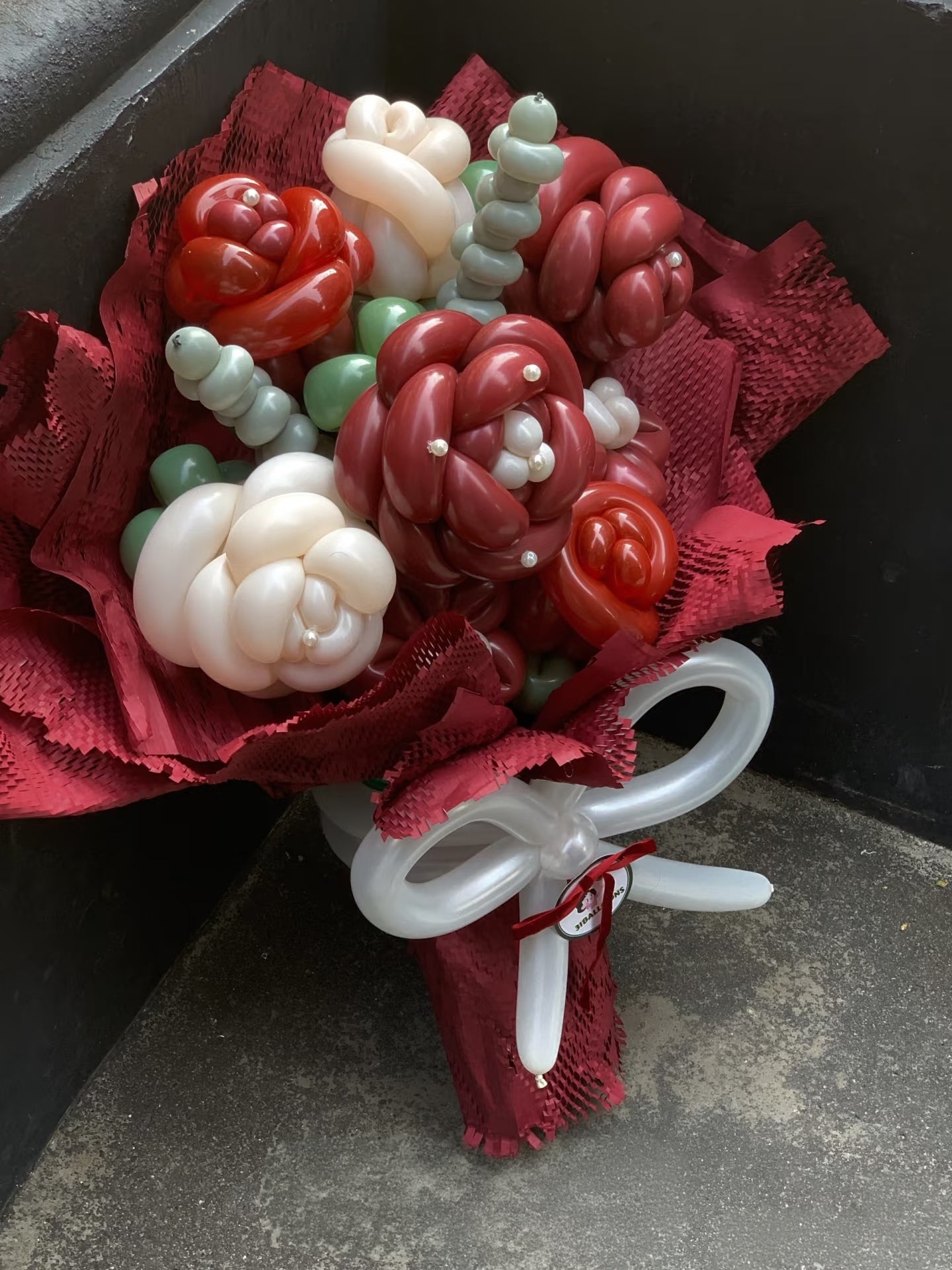 A bold bouquet that whispers elegance with every curve. The Crimson Grace arrangement features deep red camellia-style balloon roses, soft ivory blooms, and milky sage accents — hand-wrapped in layered burgundy mesh and crowned with a pearl-white balloon ribbon.