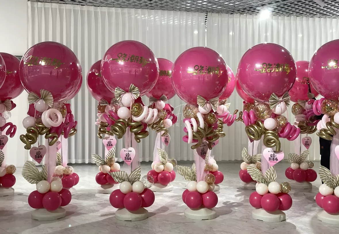 - Decorative accents: curly balloons, polka dot clear balloons, and structured support