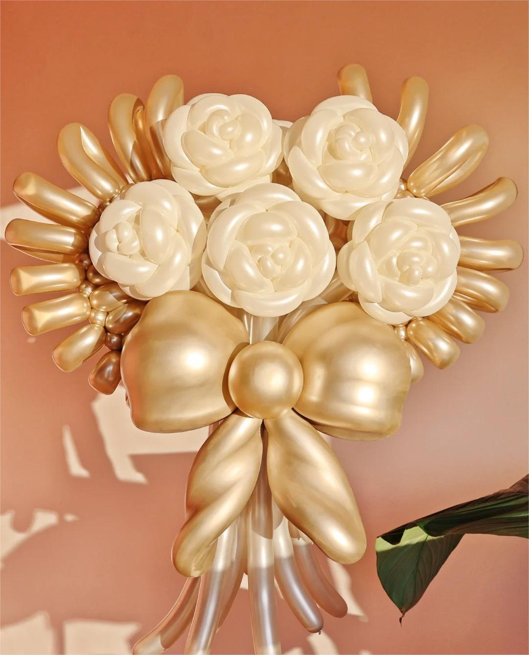 A statement of elegance, light, and timeless celebration. The Golden Camellia bouquet is sculpted entirely from air in shimmering oyster white and metallic gold, creating a radiant composition of camellia-inspired blooms and soft floral bursts.