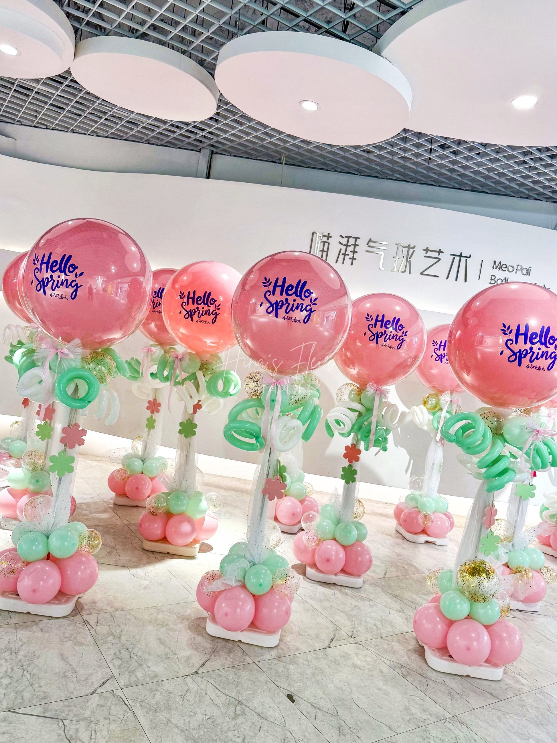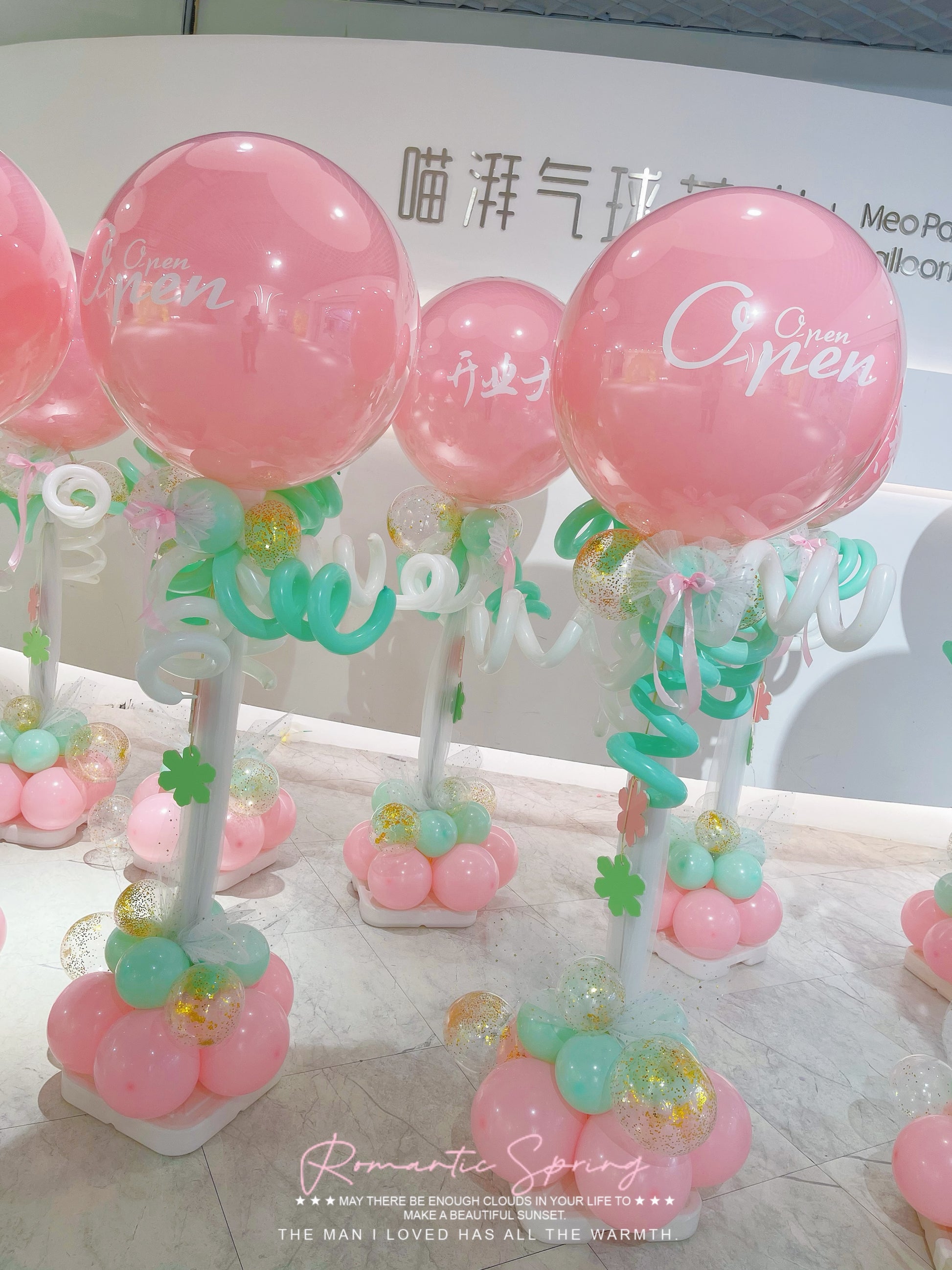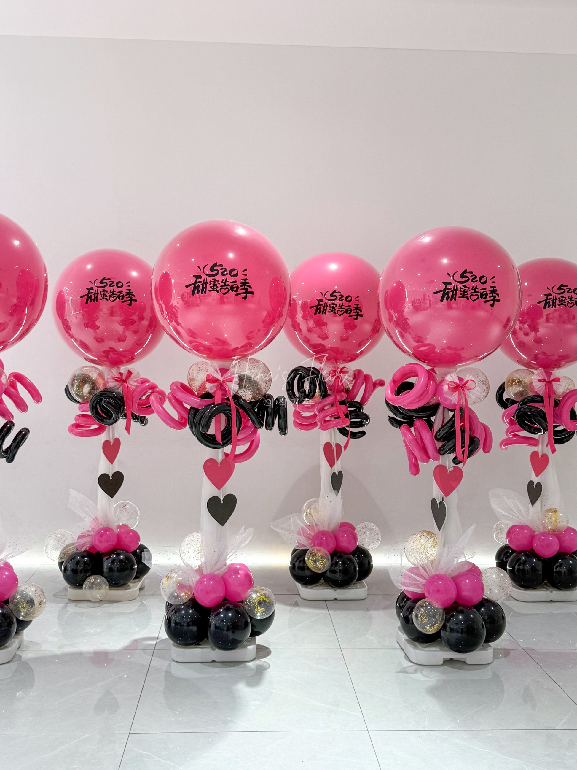 - Decorative accents: curly balloons, polka dot clear balloons, and structured support